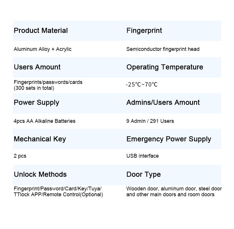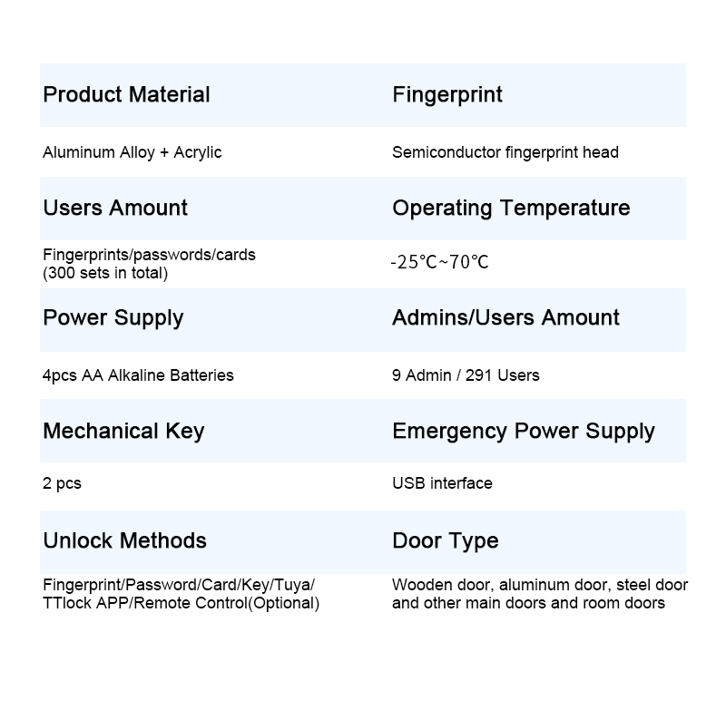 | अनलॉक करने के तरीके | Tuya WiFi/TT लॉक ऐप, पासवर्ड, फिंगरप्रिंट, कार्ड, कुंजी, USB पोर्ट |