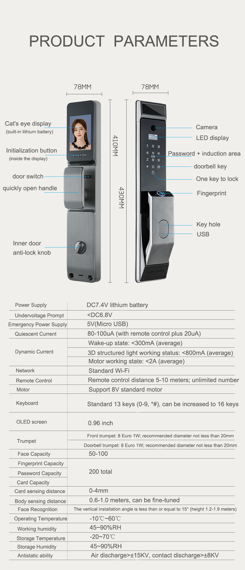 | दरवाजे की मोटाई: | 40-110 मिमी | अनलॉक के तरीके: | तुया वाईफ़ाई, पासवर्ड, फ़िंगरप्रिंट, कार्ड, कुंजी |